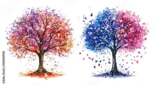 © AI_Nusantara, Obraz premium Whimsical Watercolor Trees with Colorful Blossoms and Falling Leaves