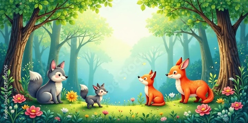 © Febz, Fototapeta premium Whimsical watercolor woodland animals & lush forest , serene, forest