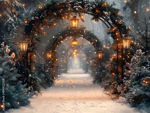 Fototapeta premium Whimsical winter arch decorated with lanterns, misty snowflakes, and lush...