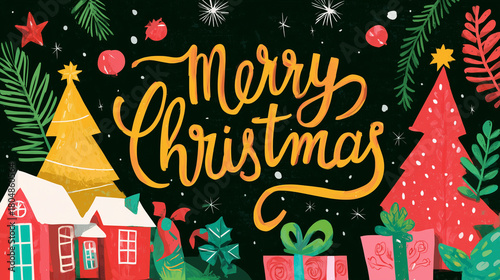 Fototapeta premium Whimsical winter holiday illustration showing a peaceful village covered in snow with a festive Christmas greeting, perfect for seasonal messages, cards and digital designs