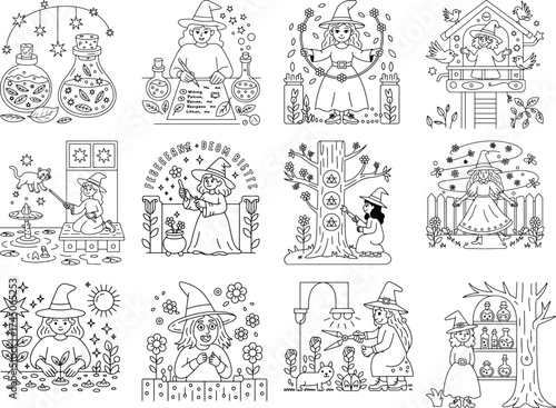 Fototapeta premium Whimsical Witchy Line Art Scenes With Potions Animals Nature And Magical Rituals Keywords: witch, wizard, magic, spell, potion, cauldron, broom, hat, stars, moon, sun, plants, flowers, trees