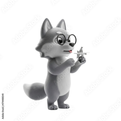 © novi syahdah, Obraz premium Whimsical Wolf Character with Glasses Ponders Origami Bird on Black Backdrop
