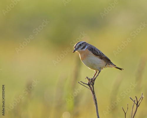 © Aleksandr 44ARH, Fototapeta premium Whinchat bird close-up in the meadow grass. Morning light.