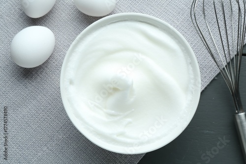 © New Africa, Fototapeta premium Whipped whites in bowl, whisk and eggs on grey wooden table, flat lay
