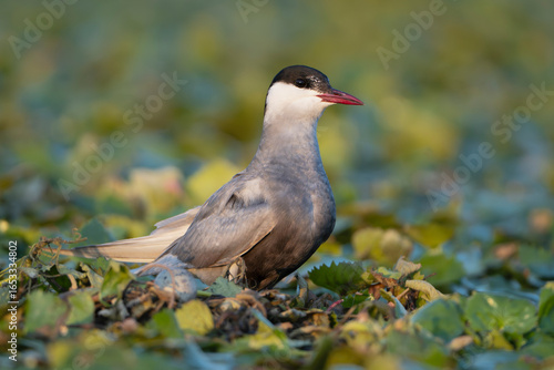 Naklejka premium whiskered tern - Chlidonias hybrida standing on floating nest with egg. Photo from Danube Delta in Romania. Chlidonias hybrida hybrida.