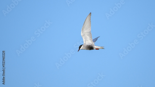 Fototapeta premium Whiskered Tern with a black cap glides through the clear blue sky.