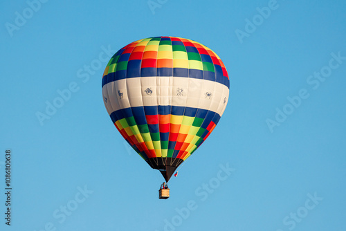 Naklejka premium Whispers of Color: A Vibrant Hot Air Balloon Ascends into the Crisp Blue Sky, Painting Dreams Above the World.