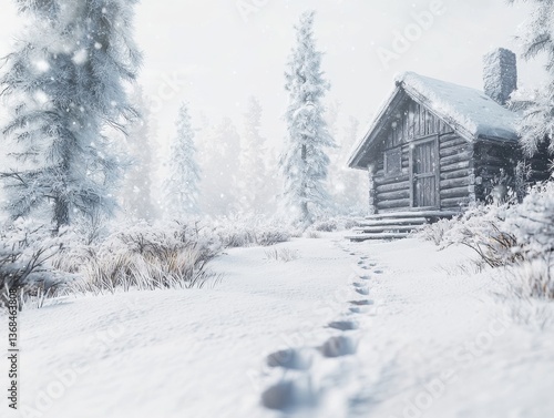 Naklejka premium Whispers of the Weather: A Captivating Snowy Scene Featuring a Serene Cabin...