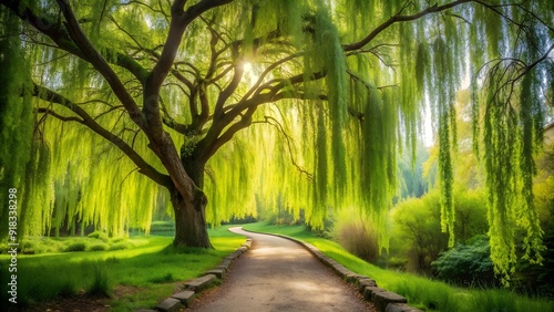 © boxs, Naklejka premium Whispers of the Willow: A Shy Boy's Secret Garden generative AI