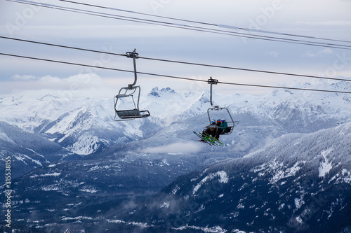 © edb3_16, Obraz premium Whistler, British Columbia, Canada. People going up the mountain on a Chairlift during a vibrant and cloudy winter day.