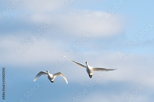 Obraz premium Whistling swans flying in Lake Hyoko, Niigata prefecture, Japan