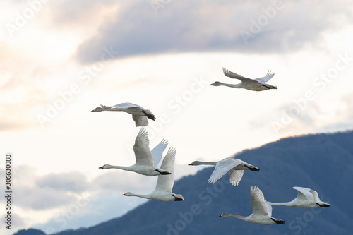 Obraz premium Whistling swans flying in Lake Hyoko, Niigata prefecture, Japan