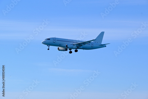 © Maksim Mikhailov, Obraz premium White aircraft on final approach to the airfield under a bright blue sky.