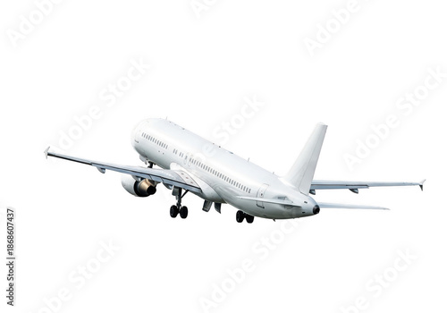 © SAIKAT, Fototapeta premium White airplane ascending against a stark black background