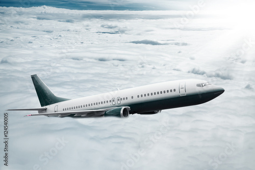 Fototapeta premium White airplane flying higher clouds at daytime