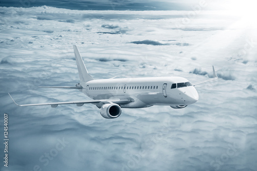 Fototapeta premium White airplane flying higher clouds at daytime