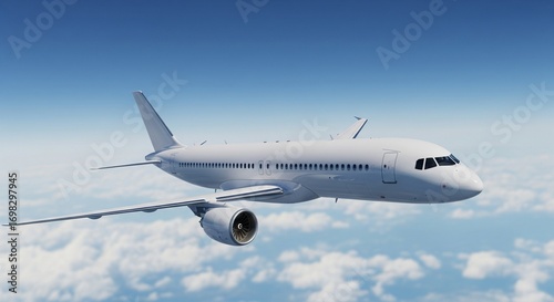 Fototapeta premium White Airplane in Flight Over Fluffy Clouds and Blue Sky
