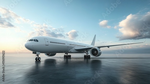 © Ahmad-Muslimin, Obraz premium White Airplane on Runway at Sunset