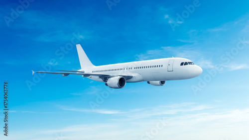 © Aryanto, Obraz premium White airplane side view flying in the blue sky background. Modern passenger jet airplane.