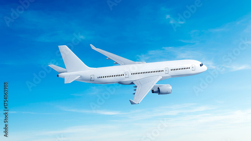© Aryanto, Obraz premium White airplane side view high angle flying in the blue sky background. Modern passenger jet airplane.