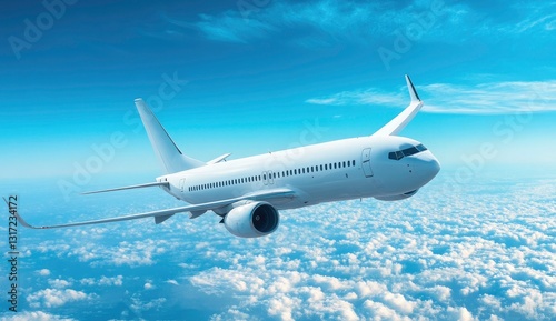 © Divine123victory, Fototapeta premium White Airplane Soaring Above Fluffy Clouds