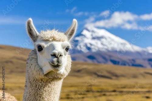 © MILKY_PS, Obraz premium White Alpaca in Andean Mountain Landscape