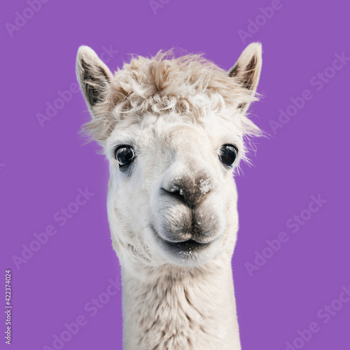 Obraz premium White alpaca isolated on purple background. South American camelid.