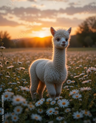 © Sukatno, Fototapeta premium White Alpaca Standing in a Daisy Field at Sunset