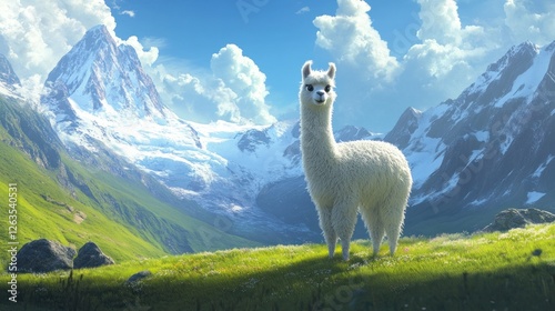Fototapeta premium White alpaca standing in a mountain meadow.