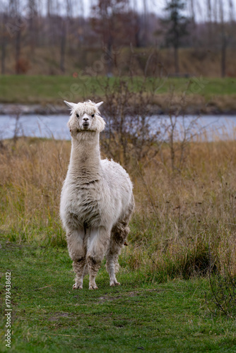 © Piotr, Naklejka premium White alpaca standing on grassy path near river in natural landscape