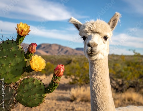 © Ikan, Naklejka premium White alpaca stands near cactus with vibrant yellow flowers, sunny day