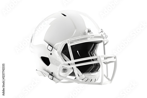 © Lucky, Fototapeta premium White American football helmet isolated on cut out PNG or transparent background. Perfect for themes related to sport football. Helmet features glossy finish, bold team colors, and sturdy faceguard.