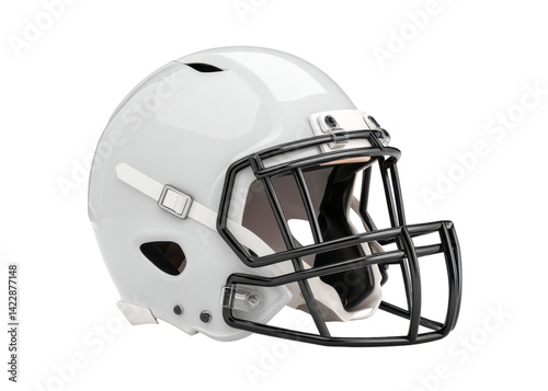 © Bismillah, Fototapeta premium White American football helmet with black face mask on a transparent background. Sports equipment for protection.