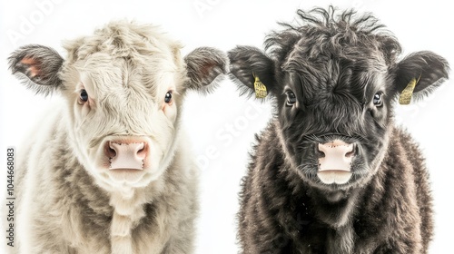 © Johnathan, Fototapeta premium White and Black Calves Gazing Curiously Against a Bright Backdrop Generative AI