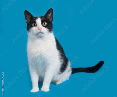 © Hanna Darzy, Fototapeta premium White and black cat sittng on blue