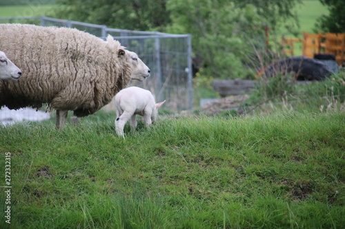 Obraz premium White and black sheeps with lamb on a meadow in Stompwijk the Netherlands