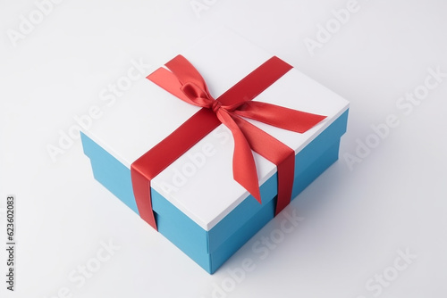 Obraz premium White and blue giftbox with red ribbon, white background. Generative AI