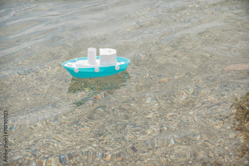 Naklejka premium white and blue toy boat floating on the seashore