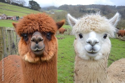 © Svetlana Lerie, Obraz premium White and brown alpacas in an outdoor farm setting. Cute farm woolly animals