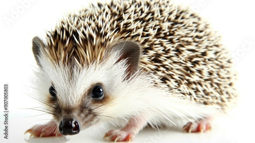 Obraz premium White and brown hedgehog with a black nose and brown eyes. It is standing on a white surface