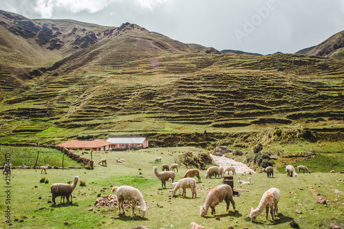 © Lozzy, Fototapeta premium White and brown herd of llamas and alpacas on a small farm in the hills of rural Peru