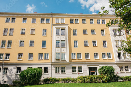 Fototapeta premium white and orange apartment house exterior green grass in the foreground