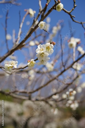 © ikwc_expf, Obraz premium White and pink colored ume blossom (Shiraume) and blue sky