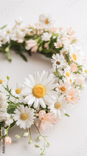 Obraz premium white and pink daisies and flowers in a wreath on white background