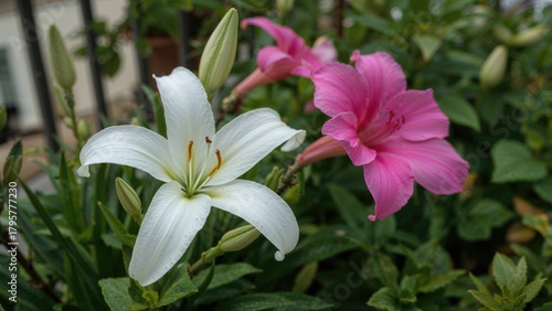© Sona, Fototapeta premium White and pink lilies in a garden setting.