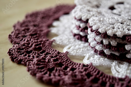 © Andrei, Obraz premium White and purple hand hooked coaster. Knitted holders for hot work