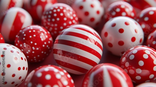 Fototapeta premium White and red glittering Christmas ornaments ball with featuring stripes and...