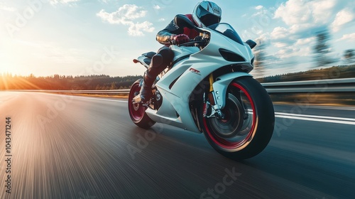 Obraz premium White and red motorcycle speeding on open road fairings reflecting sunlight...