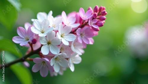 Fototapeta premium White and violet lilac blooms spill from a branch, nature, greenery, flowers
