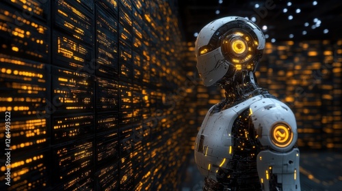 © Chirawan, Fototapeta premium White Android Robot in Dark Orange Digital Environment